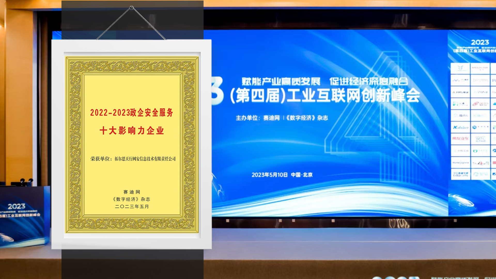 2023年5月10日,赛迪网、《数字经济》杂志,联合赛迪数通等共同举办的《2023(第四届)工业互联网创新峰会》正式揭晓。峰会以“赋能产业高质量发展 促进经济深度融合”为主题。天行网安凭借多年政企服务经验和深厚的技术能力在本次创新优秀成果评选中脱颖而出,荣获“2022-2023政企安全服务十大影响力企业”奖项。